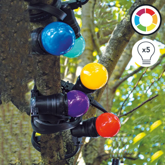 Ce pack de 5 ampoules sphériques LED multicolores apporte une lumière vive et festive à vos guirlandes. Chaque ampoule diffuse 30 lm pour un rendu décoratif bien visible, idéal quand une guirlande paraît trop terne ou irrégulière après quelques saisons. Les couleurs variées, dont le rouge, donnent du relief à une terrasse, un balcon ou une pièce. Le format boule s’intègre naturellement aux guirlandes guinguettes.