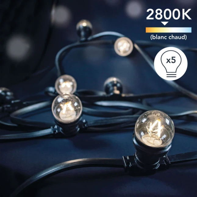 Le principal souci sur une guirlande est souvent la casse lors du rangement ou des manipulations. Ici, la matière plastique haute résistance aide à limiter ce risque par rapport au verre, tout en restant légère. Le pack de 5 ampoules de rechange permet de garder une guirlande homogène et d’anticiper les pannes sans immobiliser l’éclairage. Pour un usage régulier, la longévité LED réduit la fréquence des remplacements.