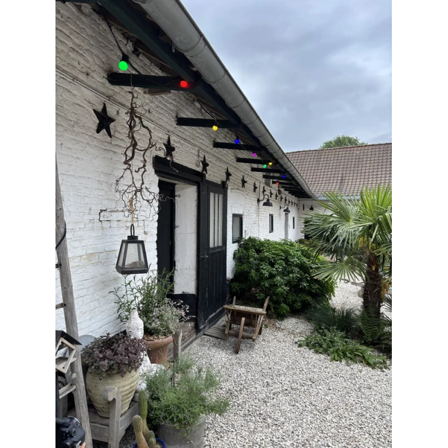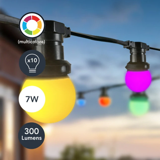 Cette guirlande guinguette LED de 10 m apporte une lumière décorative pour une terrasse, un jardin, un balcon ou une pièce de vie. Elle intègre 10 ampoules multicolores à culot E27, pour une teinte joyeuse sans éclairage agressif. Chaque ampoule consomme 0,7 W et délivre environ 30 lm, soit 300 lumens au total. Le câble noir se fond facilement dans le décor et reste discret en journée.