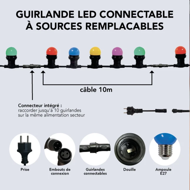 Les 10 ampoules LED sont fournies et remplaçables : vous évitez de devoir changer toute la guirlande si une seule lampe ne fonctionne plus. Le culot standard E27 simplifie le remplacement et permet de conserver la même longueur et le même rendu lumineux. Pour lever un doute de compatibilité, cette guirlande est annoncée compatible avec les références 167490, 54422920, 54434220 et 54446520. Une solution pratique aussi bien pour un usage ponctuel que récurrent.