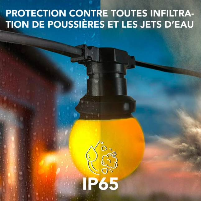 Le principal souci avec une guirlande extérieure est la tenue sous la pluie et la poussière. Ici, l’indice IP65 aide à garder un éclairage fiable en usage dehors, même en conditions humides. Autre point pratique : le modèle est connectable, ce qui permet de raccorder jusqu’à 10 guirlandes pour couvrir une grande longueur sans multiplier les prises. La faible puissance totale limite la consommation tout en gardant une ambiance lumineuse régulière.