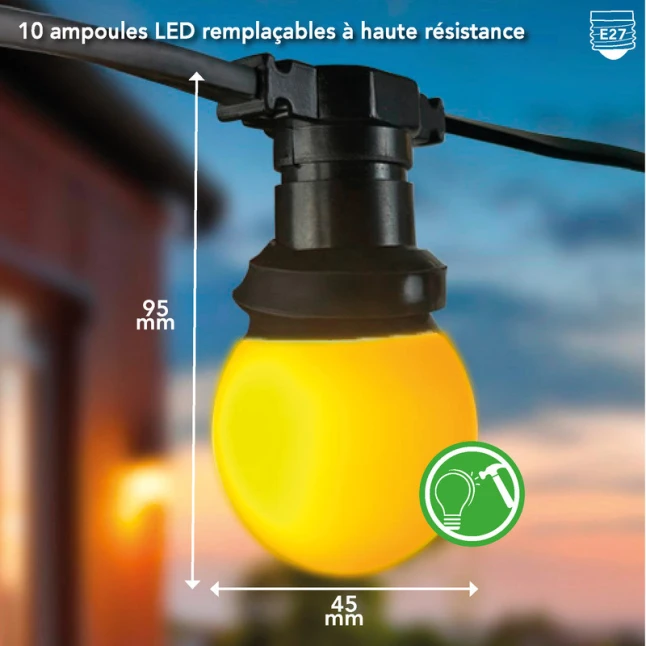 Les 10 ampoules LED sont fournies et remplaçables : vous évitez de devoir changer toute la guirlande si une seule lampe ne fonctionne plus. Le culot standard E27 simplifie le remplacement et permet de conserver la même longueur et le même rendu lumineux. Pour lever un doute de compatibilité, cette guirlande est annoncée compatible avec les références 167490, 54422920, 54434220 et 54446520. Une solution pratique aussi bien pour un usage ponctuel que récurrent.