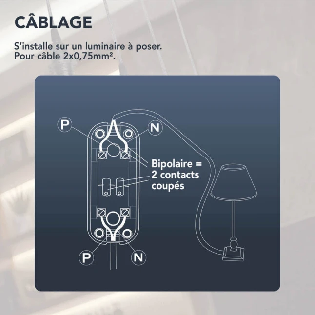 Le modèle bipolaire coupe les deux conducteurs du câblage, ce qui répond à un besoin fréquent de sécurité lors d’une modification ou d’une réparation. Cette coupure complète limite les doutes liés au sens de branchement et apporte une tranquillité d’esprit au quotidien. L’interrupteur sur câble est prévu pour des appareils de classe II. Pour les usages réguliers, la bascule offre un geste clair et un contact stable, apprécié sur des luminaires souvent sollicités.