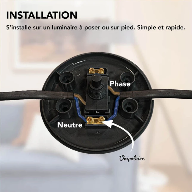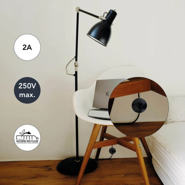 Conçu pour un câble électrique 2x0,75 mm², cet interrupteur poussoir s’adapte aussi aux câbles plats, souvent utilisés sur les lampes de table et les lampadaires. Il répond au doute le plus fréquent au moment de remplacer un interrupteur en ligne : la section du câble et la capacité électrique. Sa tenue en charge annoncée à 6 A et 250 V convient aux usages courants d’éclairage sur secteur.