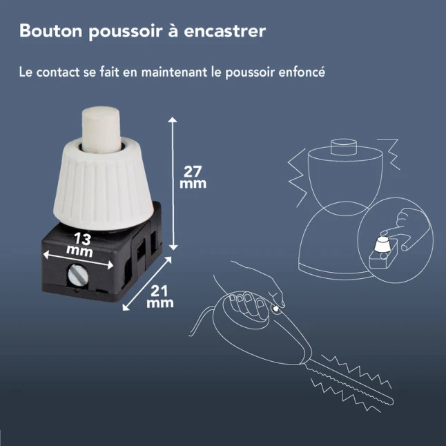 La fixation par écrou assure un maintien stable dans la façade de l’appareil, avec une finition propre une fois le bouton encastré. La connexion à vis facilite un raccordement ferme des conducteurs et limite les faux contacts, un avantage apprécié lors des dépannages rapides comme des montages soignés. Pour lever un doute de compatibilité, ce mini interrupteur encastrable convient lorsque vous disposez d’un perçage adapté et d’une épaisseur de support permettant le serrage de l’écrou.