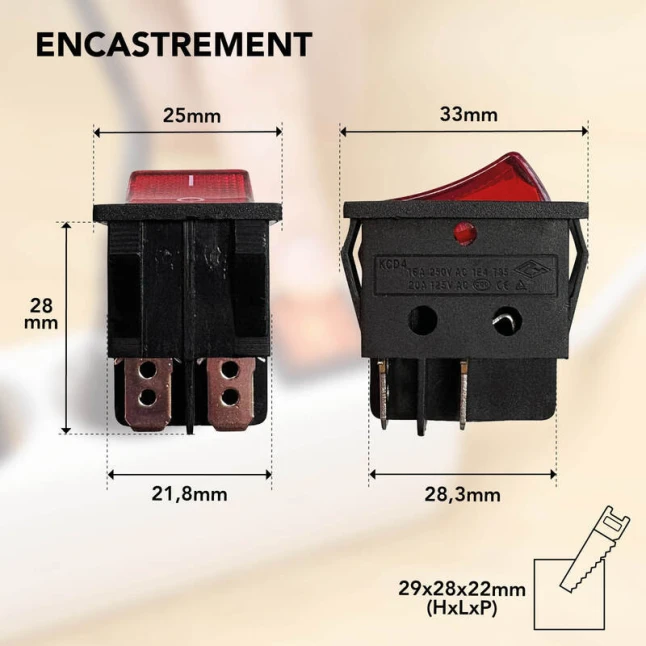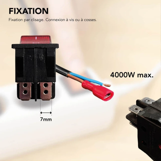 Conçu pour être encastré, ce mini interrupteur noir s’intègre proprement sur un luminaire, un boîtier ou un capot, sans ajout d’encombrement. La fixation par clipsage maintient l’ensemble bien en place. La connexion à cosses permet un raccordement net et rapide avec des cosses adaptées, apprécié quand on répare, modifie ou crée un montage. Le résultat est propre, stable et facile à contrôler lors d’une vérification.
