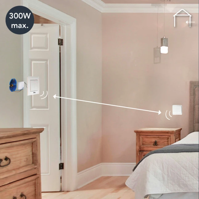 Conçu pour une alimentation 230 V, le système pilote un circuit d’éclairage jusqu’à 300 W maximum. Il convient aux ampoules courantes, y compris LED, avec une plage de puissance indiquée de 8 W à 300 W, ce qui rassure si vous craignez un manque de compatibilité. La portée annoncée atteint 70 m en conditions favorables, pratique pour commander depuis une autre zone de la maison ou d’un atelier.