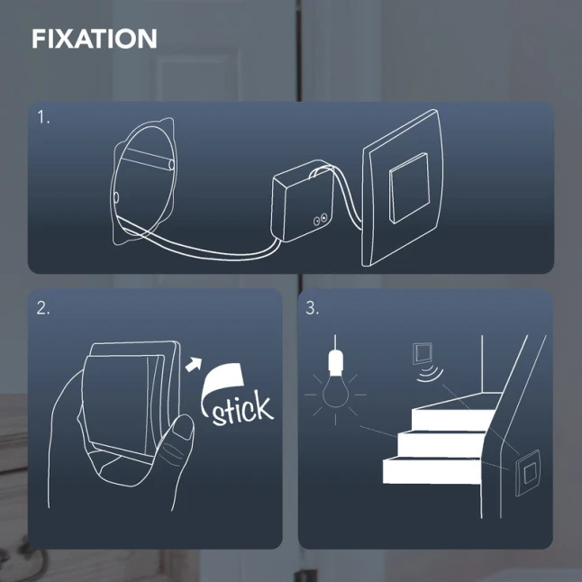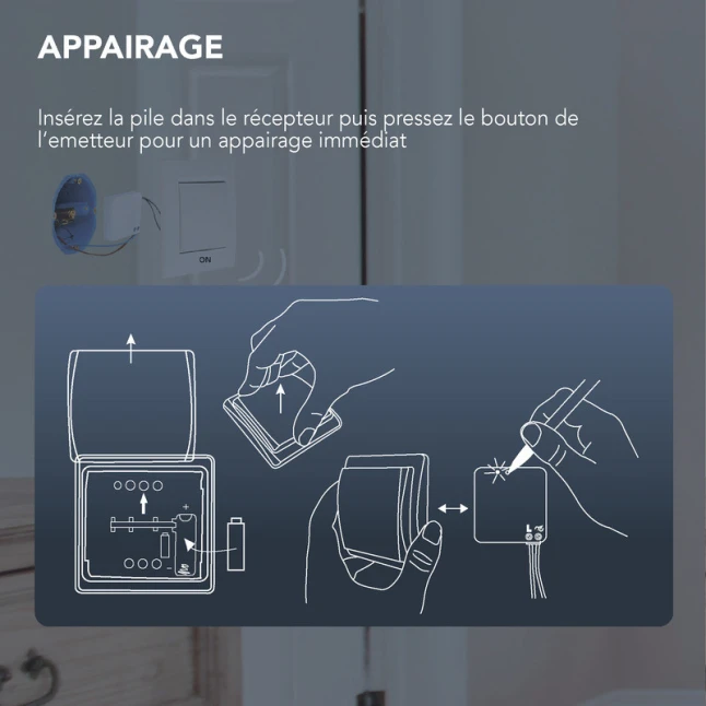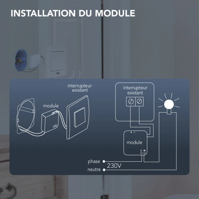 Le module se place derrière un interrupteur simple allumage existant, tandis que l’interrupteur plat sans fil peut être positionné où vous en avez besoin. La finition blanche en plastique reste sobre et s’intègre facilement. Ce kit évite les saignées et limite les dégâts sur les surfaces, un vrai gain de temps pour les interventions rapides, tout en offrant un contrôle d’éclairage stable et confortable jour après jour.