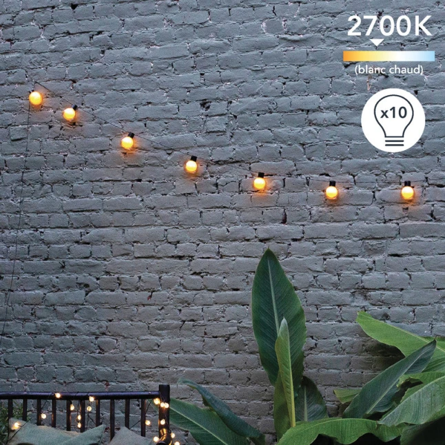 Cette guirlande guinguette solaire LED apporte une lumière blanc chaud 2700K, agréable pour un jardin, une terrasse, un balcon ou une pergola. Avec 6,15 m de longueur et 10 ampoules LED, elle délimite facilement un espace et crée un éclairage décoratif visible sans éblouir. Son câble noir et sa conception en plastique se fondent dans le décor, tout en restant faciles à nettoyer après une saison d’usage extérieur.