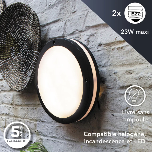 Ce luminaire se place au mur ou au plafond pour éclairer une terrasse, une entrée, une cave, un abri de jardin ou un couloir. Le double E27 évite les formats spécifiques et facilite le remplacement des ampoules quand nécessaire. Pour les chantiers et la maintenance, ce choix standard limite les références à stocker. Ampoules non incluses. Garantie 5 ans pour une utilisation plus sereine, avec un produit pensé pour durer.