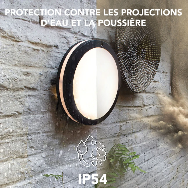 Le point de doute le plus fréquent concerne la résistance à l’humidité et à la poussière. Avec son indice de protection IP54, ce hublot est conçu pour supporter les projections d’eau et limiter l’entrée des saletés, ce qui le rend adapté aux zones couvertes ou semi-exposées. Son corps en métal type aluminium, finition gris foncé, apporte une bonne tenue dans le temps et une meilleure résistance aux chocs du quotidien.