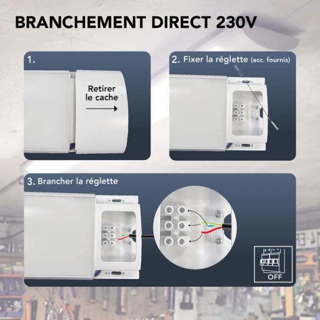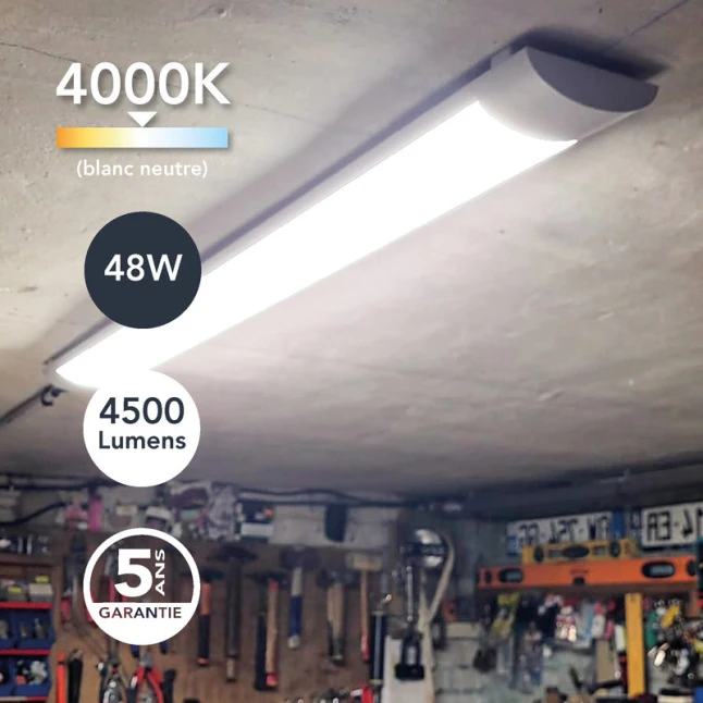 Le bornier de connexion intégré simplifie le raccordement et limite l’encombrement, un vrai gain de temps quand on veut un résultat propre. Cette solution de luminaire linéaire LED convient aussi bien pour un besoin ponctuel que pour des installations répétées, avec une finition blanche passe-partout. La garantie 5 ans apporte une réassurance claire sur la durabilité. Si votre doute porte sur l’éclairage réel, le couple 48W / 4500 lm aide à choisir sans se tromper.