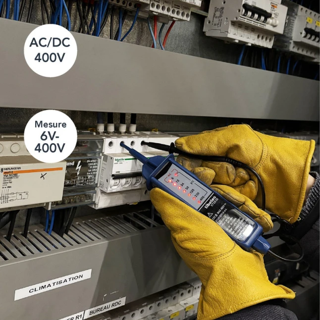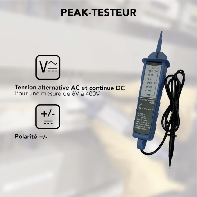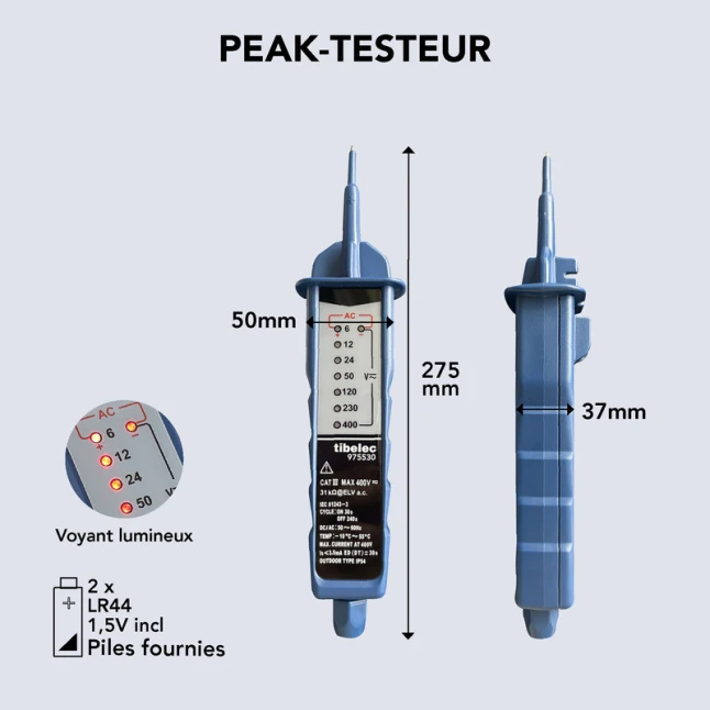 La pointe test intégrée se range au dos de l’appareil pour éviter la perte et gagner du temps entre deux contrôles. Les piles sont fournies, vous pouvez donc l’utiliser dès la sortie de l’emballage. Sa couleur bleue le rend facile à repérer dans une caisse à outils. Pour lever les doutes de compatibilité, ce testeur convient aussi bien aux mesures en alternatif qu’en continu, et sa référence 9030310090 facilite l’identification.
