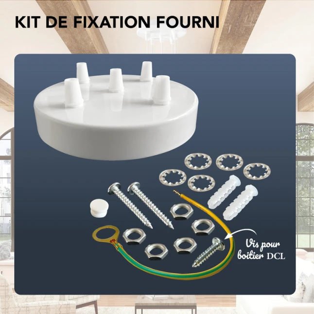 Le corps en métal apporte une bonne rigidité et une meilleure tenue dans le temps qu’un cache en plastique. Le serre-câble intégré aide à bloquer les câbles et limite les glissements, un point important quand on aligne plusieurs pendants. Le kit de fixation est fourni pour un montage stable. Le diamètre 150 mm offre un volume confortable pour organiser les connexions et obtenir une base visuellement équilibrée.