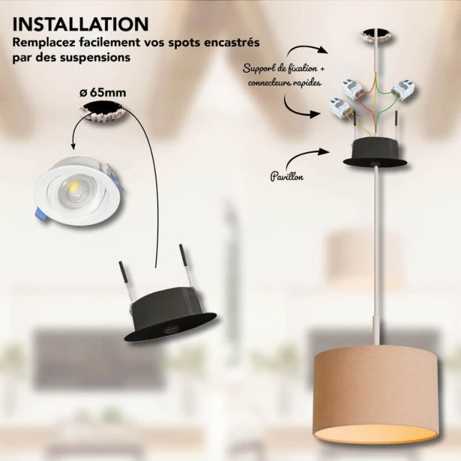 Ce pavillon à encastrer rond sert de cache-fils pour obtenir une sortie de câble propre au plafond ou au mur. Il masque la gaine et les raccordements visibles, un point souvent jugé “pas fini” après la pose d’un luminaire. Son format discret convient aussi bien pour une suspension, un plafonnier ou la transformation d’un point encastré en point de suspension. La rosace plafond noire apporte un rendu sobre et actuel.