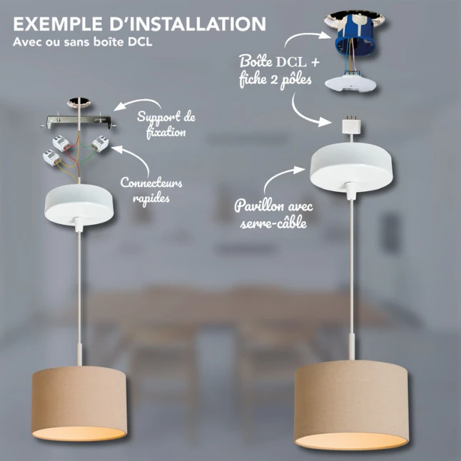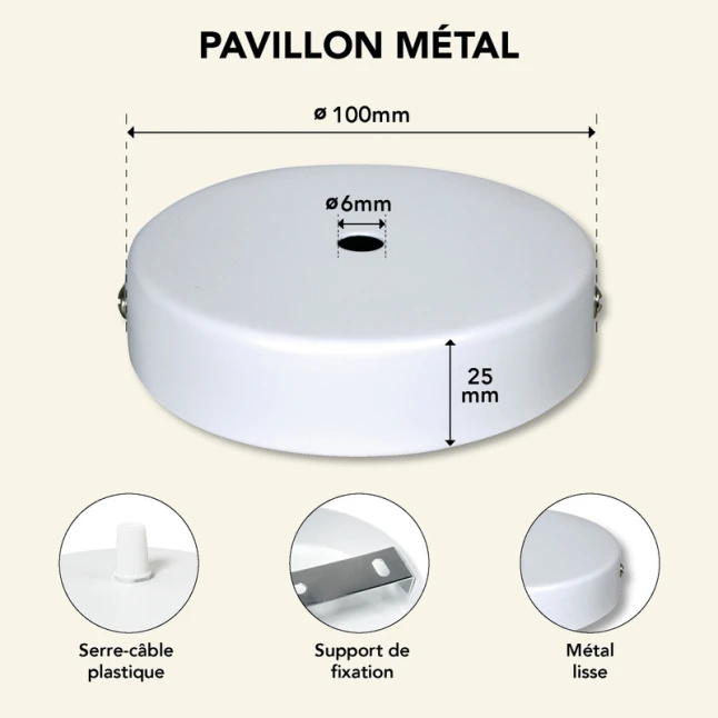 Avec un diamètre 100 mm, ce pavillon D.100 mm est volontairement plus large qu’un boîtier DCL, afin de le masquer entièrement et d’éviter qu’il reste apparent au plafond. C’est une solution simple quand on veut une base plus couvrante sans changer l’existant. Le trou de passage du câble Ø6 mm facilite le passage d’un cordon standard, tout en gardant un centrage net. Idéal pour suspension, baladeuse plafonnière ou création DIY.