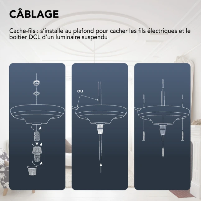 Le trou de passage du câble en Ø6 mm est prévu pour les cordons de suspension courants, afin d’éviter le doute sur la compatibilité. Le serre-câble fourni aide à maintenir le câble en place et à limiter les glissements, un point souvent recherché quand les fils bougent ou restent visibles. Ce cache-fils de plafond convient aussi bien pour une création DIY que pour une réparation rapide d’un luminaire existant.