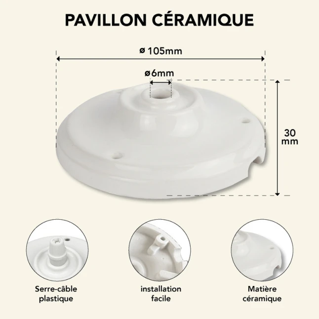 Ce pavillon cache-fils se place au plafond pour masquer les conducteurs d’un luminaire suspendu et obtenir une sortie de câble nette. Son format rond en céramique blanche apporte une finition discrète qui s’accorde facilement avec la plupart des suspensions. Avec son diamètre 105 mm, il couvre bien la zone autour du point d’alimentation, idéal quand on veut moderniser un éclairage ou remplacer une ancienne rosace.