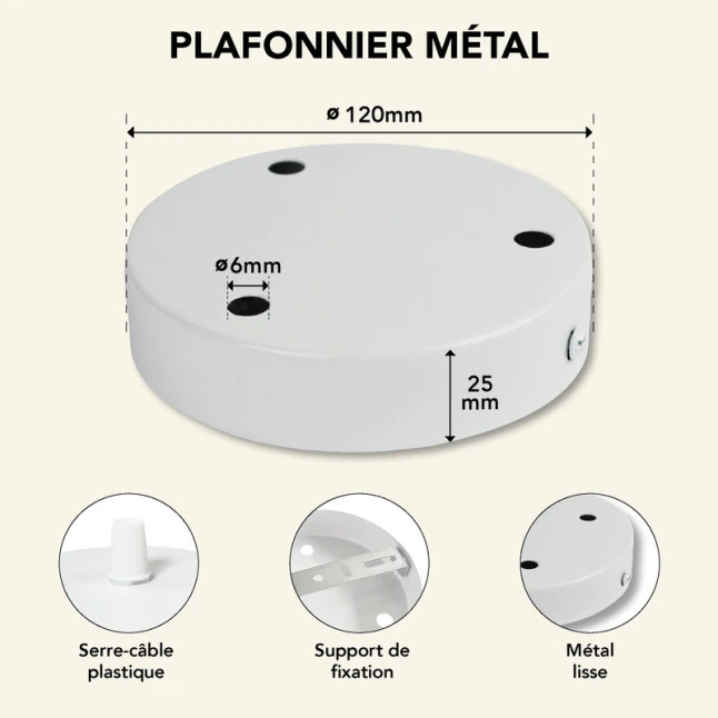Avec son diamètre 120 mm, cette rosace de plafond offre une couverture confortable sans être encombrante. Elle est pensée pour accueillir trois sorties de câble, pratique quand on veut aligner plusieurs abat-jour ou créer un éclairage à trois pendants. Sa construction en métal donne une bonne tenue dans le temps et un ajustement stable. Si vous hésitez sur les dimensions, le format D.120 mm convient bien aux caches-fils ronds standard.