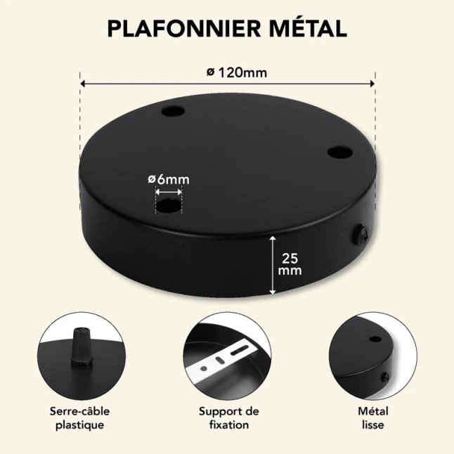 Avec son diamètre 120 mm, ce cache-fils plafond reste discret tout en laissant l’espace nécessaire pour organiser les raccordements. Le format rond s’adapte bien aux plafonds standards et aux rosaces existantes de taille proche. Il convient pour passer trois descentes de câble, que vous utilisiez des fils textiles ou des câbles classiques, tant que le passage correspond à votre section. La finition métal noir offre une bonne tenue dans le temps et une apparence uniforme.
