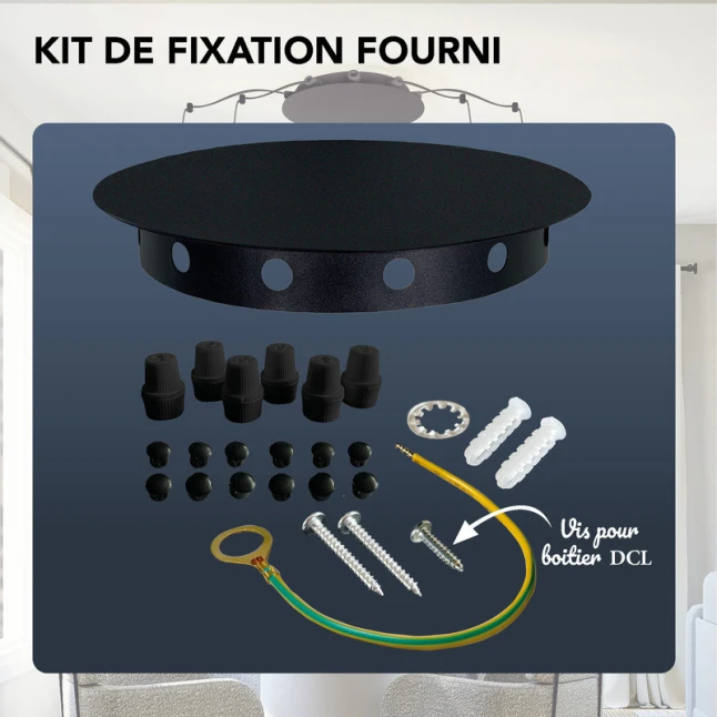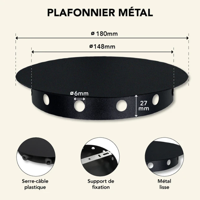 La rosace plafond métal noire apporte une finition sobre et résistante, adaptée aux pièces de vie comme aux espaces de travail. Le serre-câble fourni aide à maintenir les câbles en place et à limiter les mouvements au niveau du plafonnier rond. Un câble de connexion à la terre est inclus, utile avec un corps en métal, ainsi qu’un kit de fixation pour une pose fiable et durable.