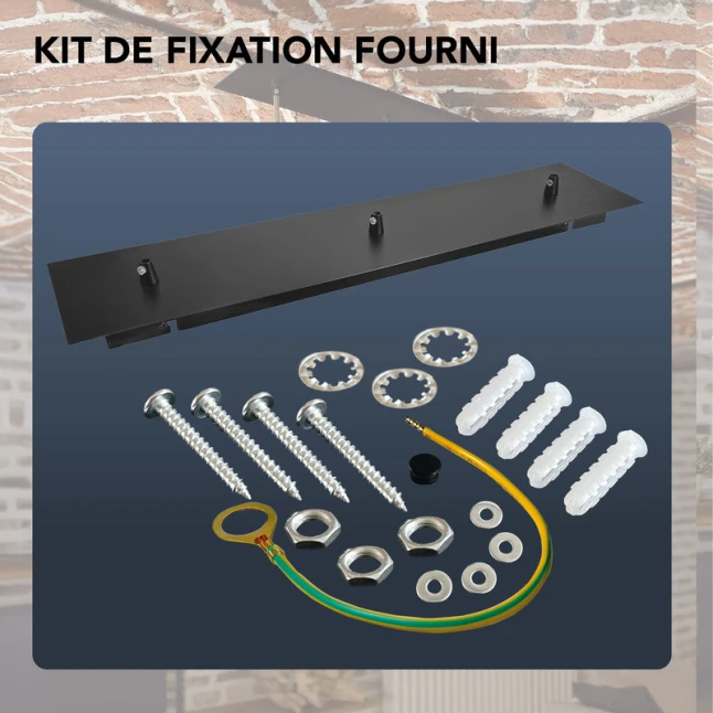 Le serre-câble fourni maintient les 3 descentes en place et aide à éviter le glissement des câbles avec le temps, un point sensible sur les luminaires multiples. Le câble de connexion à la terre est inclus pour un raccordement adapté aux luminaires avec conducteur de protection, et le kit de fixation est fourni pour un montage stable. La construction en métal apporte rigidité et tenue, utile autant pour une création que pour une réparation.