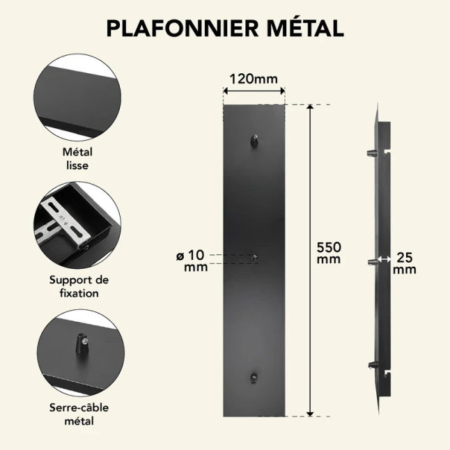 Ce plafonnier rectangulaire noir est pensé pour les projets de modification ou de création de luminaire avec trois sorties de câbles. Le point clé est simple : il accepte 3 câbles, et ses dimensions 120x550 mm permettent de répartir les descentes sur une longueur confortable. Il convient quand vous cherchez un pavillon en métal discret, sans pièces supplémentaires à prévoir, pour remplacer un cache existant ou finaliser une fabrication maison avec une finition propre.