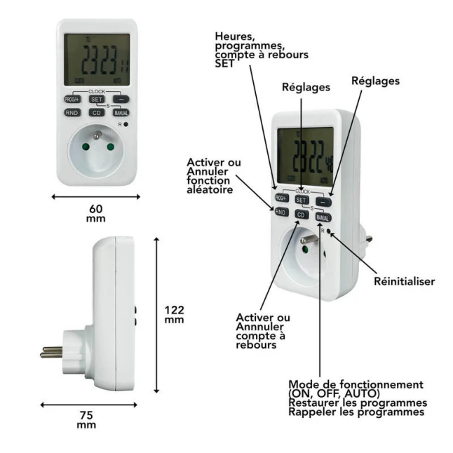 La minuterie prise propose jusqu’à 10 programmes, au choix par jour ou par semaine, pour suivre vos habitudes sans devoir tout reconfigurer. Vous pouvez ainsi réguler des usages répétitifs et limiter les fonctionnements inutiles, ce qui aide à mieux maîtriser la consommation d’énergie. Une fonction aléatoire permet aussi de simuler une présence pendant une absence, en faisant varier les horaires. Pratique pour les routines, et utile quand plusieurs appareils doivent suivre un planning.