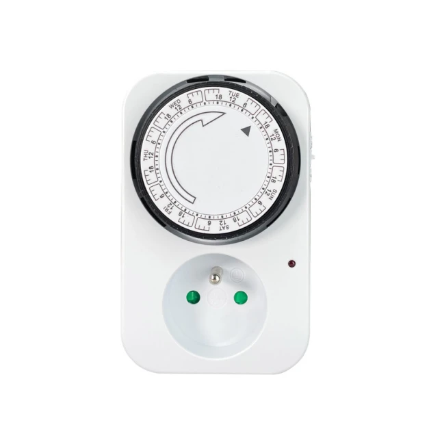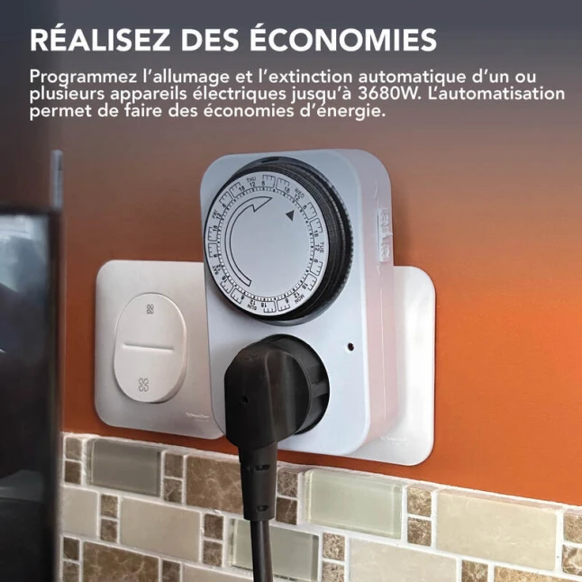 Ce programmateur hebdomadaire mécanique permet de gérer automatiquement vos appareils sur la semaine, pour éviter les oublis et les consommations inutiles. Il convient pour une lampe, une cafetière, un aquarium ou un petit équipement de chauffage, dès lors qu’ils se branchent sur une prise standard. Son voyant de fonctionnement rassure d’un coup d’œil. Le boîtier blanc en plastique reste discret et facile à intégrer près d’une prise.