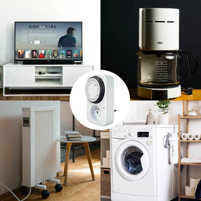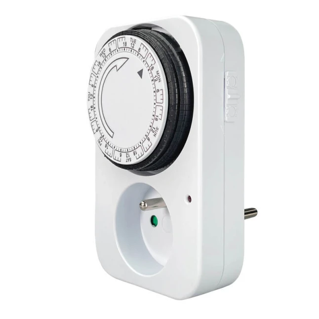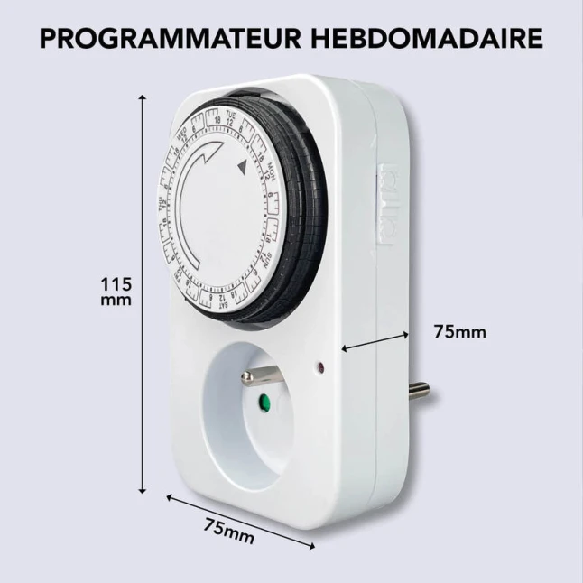 Ce programmateur hebdomadaire mécanique permet de gérer automatiquement vos appareils sur la semaine, pour éviter les oublis et les consommations inutiles. Il convient pour une lampe, une cafetière, un aquarium ou un petit équipement de chauffage, dès lors qu’ils se branchent sur une prise standard. Son voyant de fonctionnement rassure d’un coup d’œil. Le boîtier blanc en plastique reste discret et facile à intégrer près d’une prise.