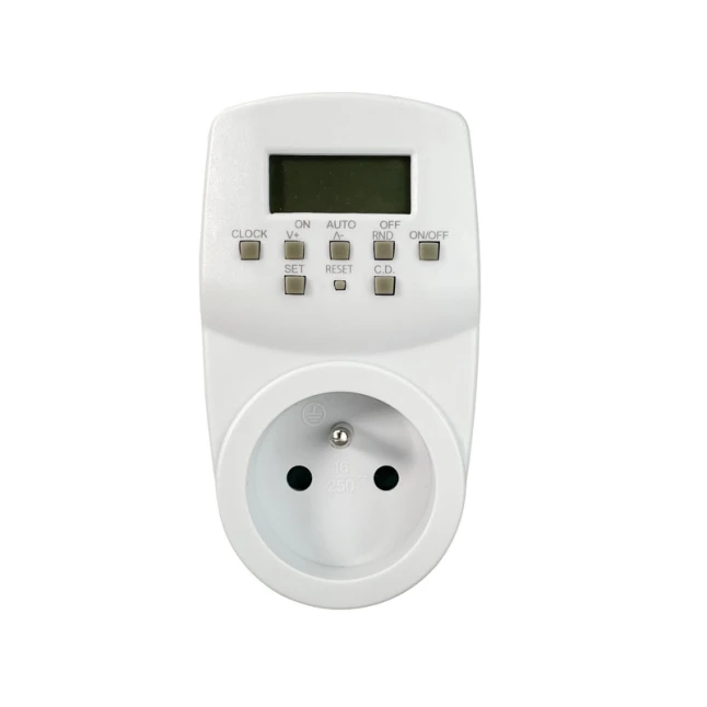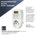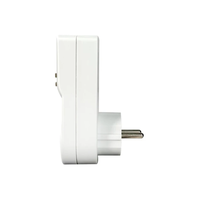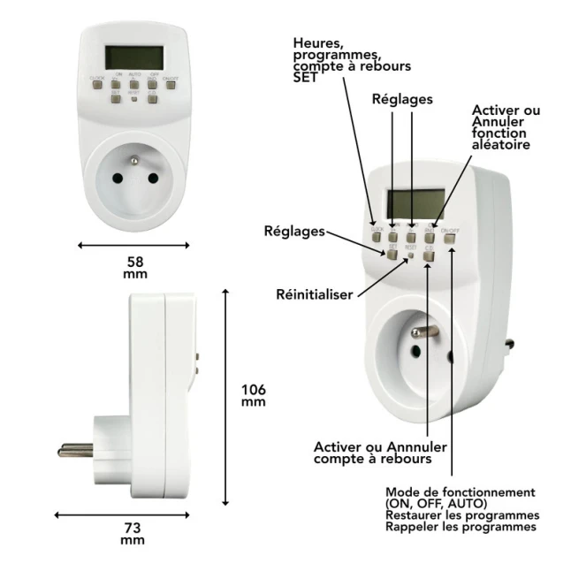 Cette prise programmable blanche est prévue pour une utilisation en intérieur et se branche simplement sur une prise avec mise à la terre. Elle accepte une puissance maximale de 3680 W, ce qui convient à de nombreux appareils domestiques, dans la limite de la puissance indiquée sur votre équipement. Son format compact 55 mm de large, 125 mm de haut et 85 mm de profondeur facilite l’intégration derrière un meuble ou près d’une multiprise.