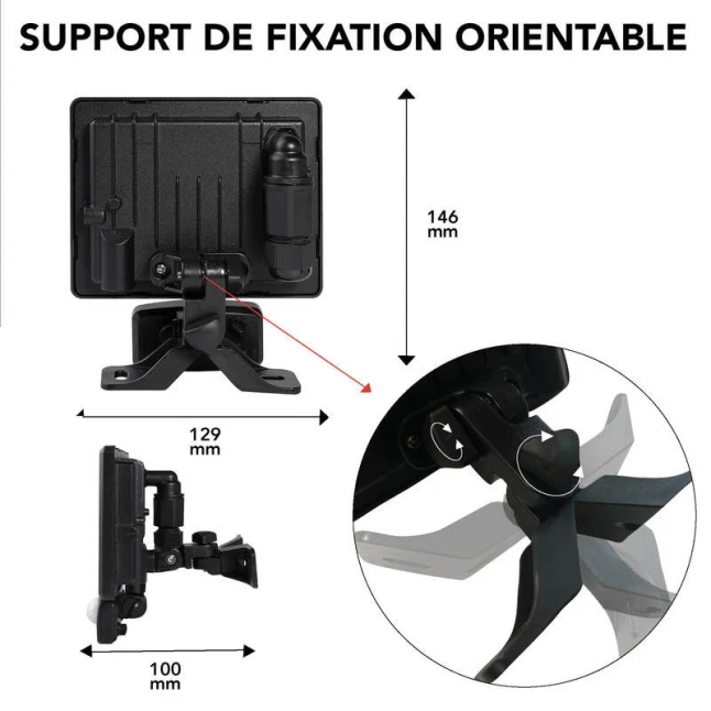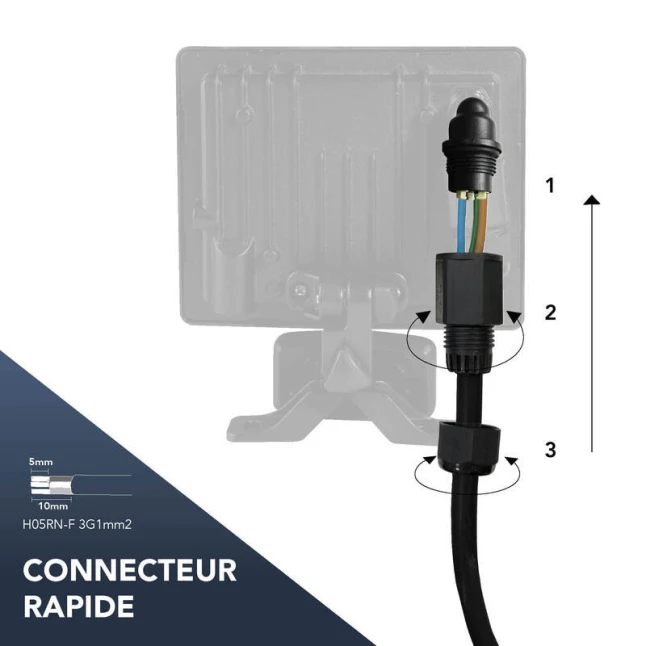 Avec son indice IP65, ce projecteur IP65 est protégé contre la poussière et les jets d’eau, pour rester fiable sous la pluie et les éclaboussures. Son corps en métal renforce la robustesse face aux chocs et aux variations de météo. Le support orientable 3D facilite l’ajustement du faisceau lumineux sans compromis, pratique pour viser un portail ou un angle sombre. Le connecteur rapide intégré fait gagner du temps au raccordement et sécurise une connexion propre.