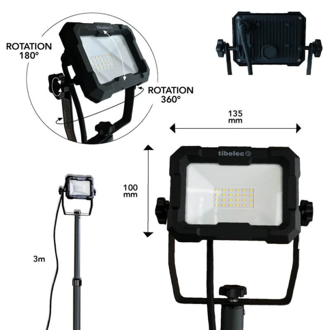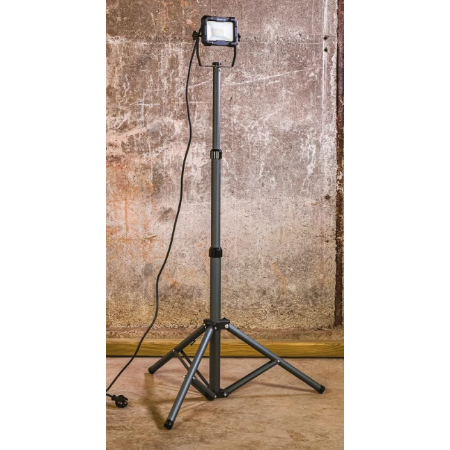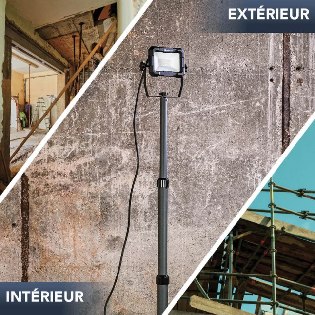 Le pied télescopique permet d’ajuster la hauteur et de placer la lampe de chantier sur pied au plus près du besoin, tout en gardant une bonne stabilité. Vous orientez l’éclairage là où il faut pour limiter les zones d’ombre sur le plan de travail. Son format compact d’environ 650 x 157 x 600 mm facilite le transport et le rangement. L’alimentation sur secteur évite les coupures liées aux batteries, et la garantie 3 ans apporte une sécurité supplémentaire.