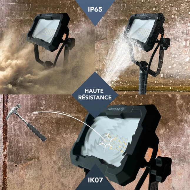 Conçu pour suivre le rythme des travaux, ce projecteur filaire combine une protection IP65 contre la poussière et les projections d’eau avec une résistance aux chocs IK07. Son corps en plastique noir est pensé pour un usage quotidien et les manipulations répétées. Un doute courant concerne l’utilisation dehors : l’indice IP65 rassure pour travailler sous la pluie fine ou dans un environnement poussiéreux, sans craindre les éclaboussures.