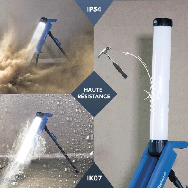 Conçue pour durer, la structure en métal noir résiste bien aux usages intensifs. L’indice IP65 protège contre la poussière et les projections d’eau, pratique en extérieur ou dans des environnements salissants. La protection IK07 limite les risques liés aux chocs lors des déplacements et manipulations. Ce projecteur de chantier sur pied reste stable et fiable pour travailler sereinement, même quand l’environnement n’est pas idéal.