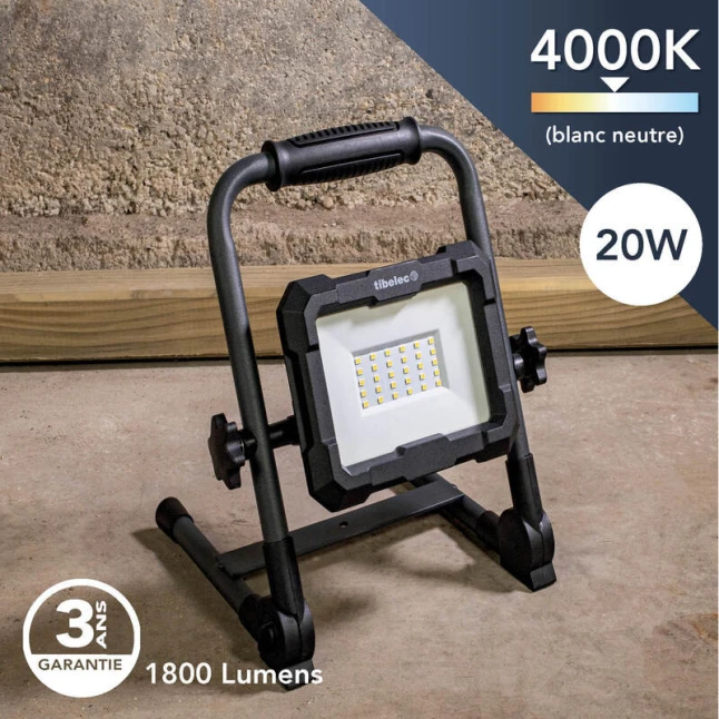 Ce projecteur LED de chantier 20W délivre 1800 lm pour éclairer clairement un atelier, un garage ou une zone de travaux. La lumière blanc neutre 4000K aide à distinguer les détails sans teinte jaunâtre, utile pour la coupe, le câblage ou la peinture. Son format extra-plat et pliable se place facilement dans un véhicule ou une caisse à outils. Vous gagnez en visibilité immédiate là où une lampe classique manque de puissance.