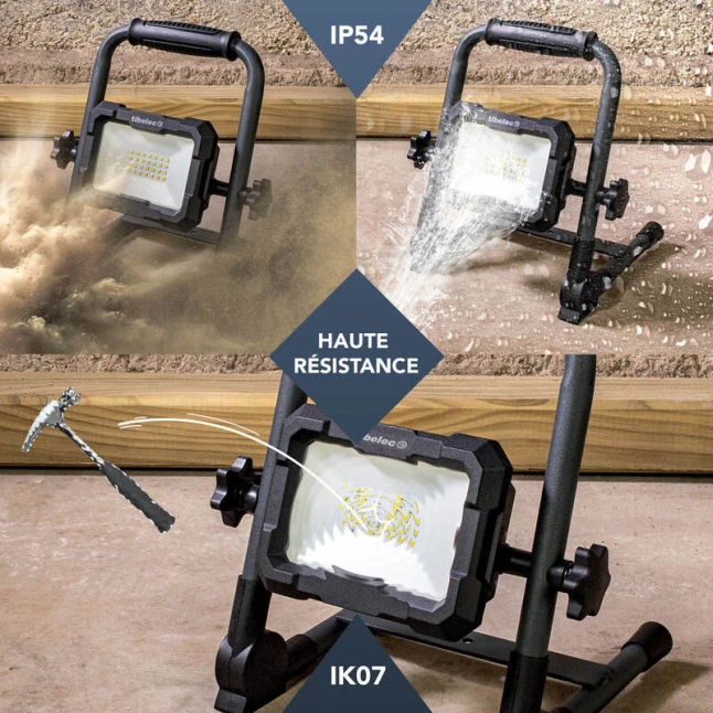 Conçu pour une utilisation intérieur/extérieur, ce projecteur LED rechargeable est protégé contre la poussière et les projections d’eau (IP54). Sa résistance aux chocs IK07 rassure en cas de manipulation fréquente ou d’environnement encombré. Le corps en plastique noir est pensé pour durer au quotidien. Pour ceux qui enchaînent les interventions, c’est un éclairage mobile fiable, avec une garantie 3 ans, qui supporte mieux les aléas qu’un simple projecteur d’appoint.
