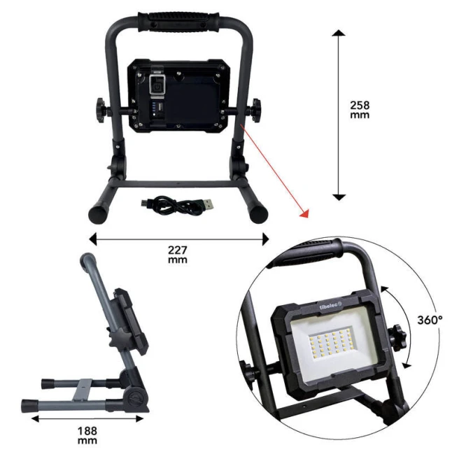 Le point bloquant le plus fréquent sur un chantier est l’absence de prise à proximité. Grâce à sa batterie rechargeable, ce projecteur sur pied fonctionne sans alimentation permanente et se recharge en USB avec ses adaptateurs fournis. Vous limitez les rallonges et les déplacements, tout en gardant un éclairage stable. Sa conception orientable permet de diriger le faisceau là où vous en avez besoin, que vous travailliez au sol ou sur un établi.