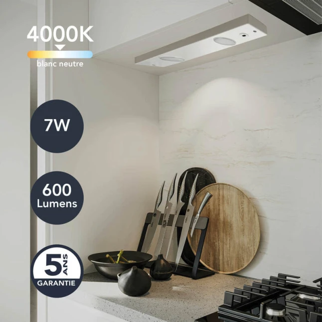 Ce bandeau LED blanc se place facilement sous un meuble de cuisine, dans une vitrine ou sous une étagère pour gagner de la lumière là où une lampe gêne. Ses deux modules lumineux délivrent 600 lumens pour seulement 7W, avec un blanc neutre 4000K proche de la lumière du jour. Vous obtenez un éclairage net et agréable, utile pour préparer, ranger ou mettre en valeur des objets sans fatiguer les yeux.