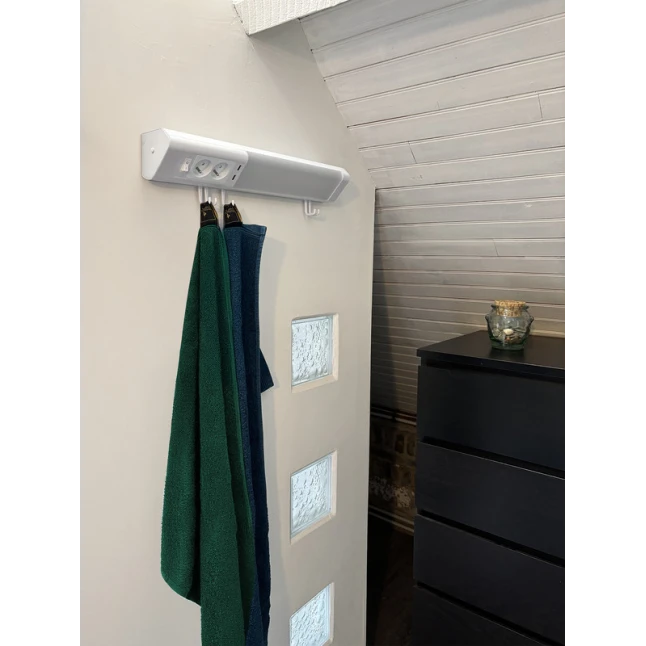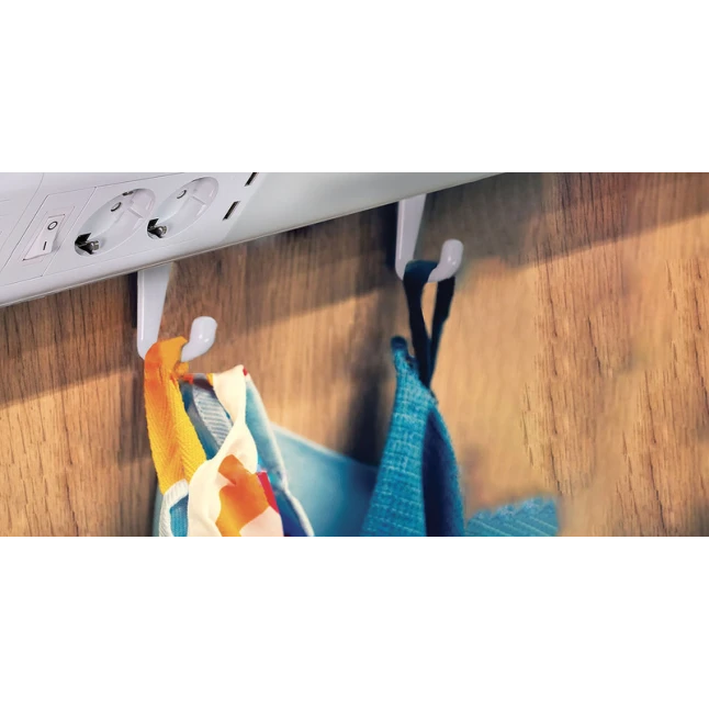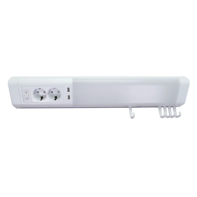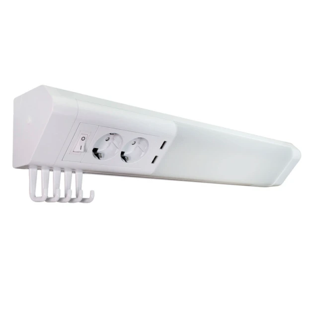 Le manque de prises est un souci fréquent dans un studio ou une chambre. Ici, l’applique LED intègre 2 prises 240V (2P+T) pour brancher une lampe, un chargeur ou un petit appareil, tout en gardant l’éclairage disponible. Les 2 ports USB permettent de recharger un téléphone ou une tablette sans adaptateur supplémentaire. Les 5 crochets ajoutent un rangement pratique pour accessoires légers.