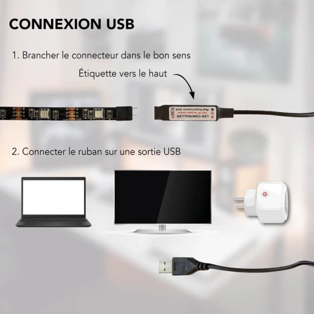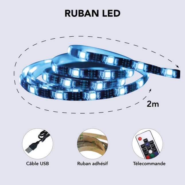 La bande LED USB se branche sur un port USB d’ordinateur, de TV ou sur un adaptateur secteur USB, pratique quand on veut éviter une prise dédiée. La télécommande permet de choisir facilement une teinte multicolore RVB ou une lumière blanche selon l’usage, puis d’ajuster l’ambiance à distance. Si vous vous demandez si la puissance suffit, les 2 m et les 600 lm sont pensés pour du rétroéclairage, du contour et des zones ciblées.