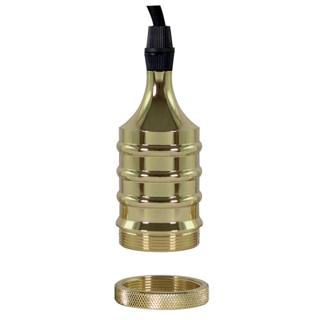 Cette monture de suspension en métal finition laiton avec câble textile noir permet de composer un luminaire simple et décoratif, au plafond, en gardant l’ampoule apparente ou en ajoutant un abat-jour. Elle répond au besoin fréquent de moderniser un point lumineux sans changer tout le système. La douille E27 en métal donne un rendu soigné et accepte la plupart des ampoules décoratives type globe, pour un style chaleureux.