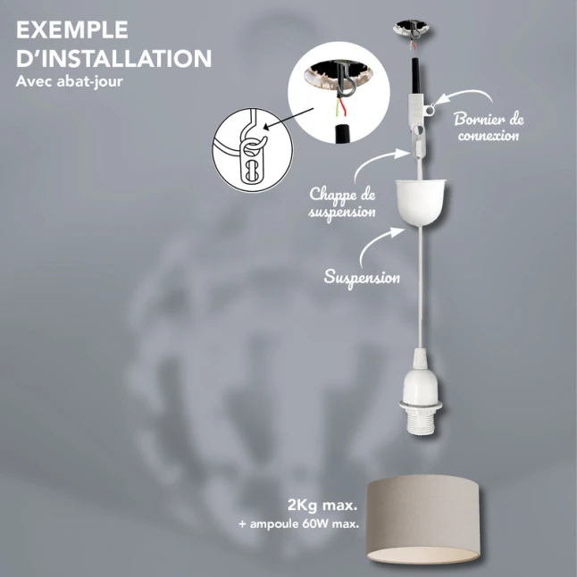 La monture équipée E14 convient aux ampoules à petit culot E14, notamment les ampoules LED E14 courantes. Elle se fixe au plafond et accepte un abat-jour ou une verrerie d’un poids inférieur à 2 kg, ce qui couvre la plupart des petits luminaires. Ce point rassure sur la tenue et évite les doutes liés à la charge. La finition blanche s’intègre facilement avec des plafonds clairs et des styles variés.