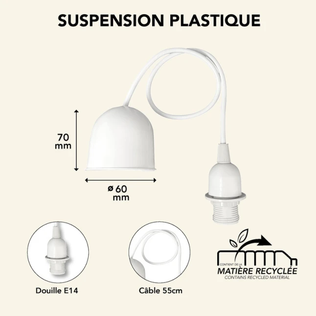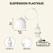 Cette suspension plafond en plastique blanc avec douille E14 permet de remplacer une monture usée ou de créer un point lumineux simple, sans changer tout le luminaire. Elle est conçue pour suspendre un abat-jour ou une verrerie et retrouver un éclairage propre et fonctionnel. Un pain point fréquent est la suspension cassée ou jaunie : ce modèle remet rapidement une base saine, prête à recevoir une ampoule à culot E14.
