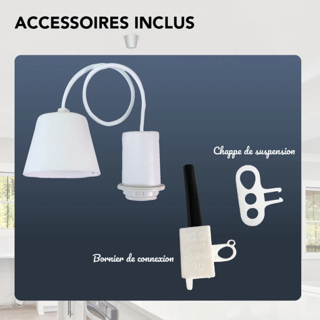 Le câble fourni 2x0,75 mm² de 0,55 m offre une longueur courante pour une suspension courte, utile quand on veut un éclairage rapproché. Le boîtier de connexion à manchon apporte une finition plus nette et une liaison électrique mieux protégée, appréciée au quotidien comme sur chantier. La monture cylindrique blanche s’intègre facilement dans de nombreux décors et se nettoie simplement.