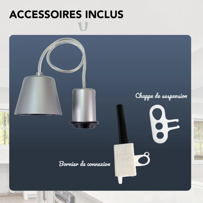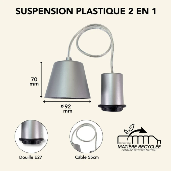 Conçue en plastique, cette suspension 2 en 1 combine légèreté et usage quotidien, tout en restant simple à intégrer dans une pièce de vie, un atelier ou un espace de travail. Elle convient aussi bien pour une réparation rapide de luminaire que pour une création DIY, en offrant un format standard facile à gérer. Les pros apprécient une référence de monture E27 courante, utile en dépannage et en remplacement à l’identique.