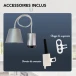 Équipée d’une douille E27, elle est compatible avec la majorité des ampoules à culot E27 du marché. Pour éviter toute mauvaise surprise, la puissance est limitée à 60 W maxi. La monture accepte un montage avec abat-jour ou verrerie dans la limite de 2 kg maxi, pratique pour conserver un diffuseur existant ou en ajouter un nouveau. La finition argentée s’intègre facilement aux décors modernes.