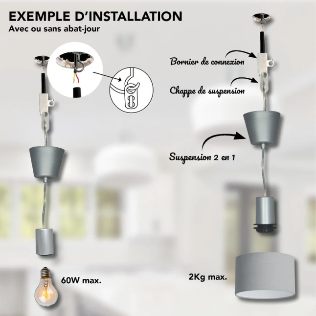 Cette monture de suspension argentée permet de réaliser facilement une suspension plafond, avec ou sans abat-jour. Son format cylindrique met en valeur une ampoule décorative type globe pour un rendu simple et actuel, ou s’adapte à une verrerie pour un style plus doux. Elle répond à un besoin fréquent : remplacer une suspension vieillissante ou composer un luminaire sur mesure sans changer tout le câblage existant.