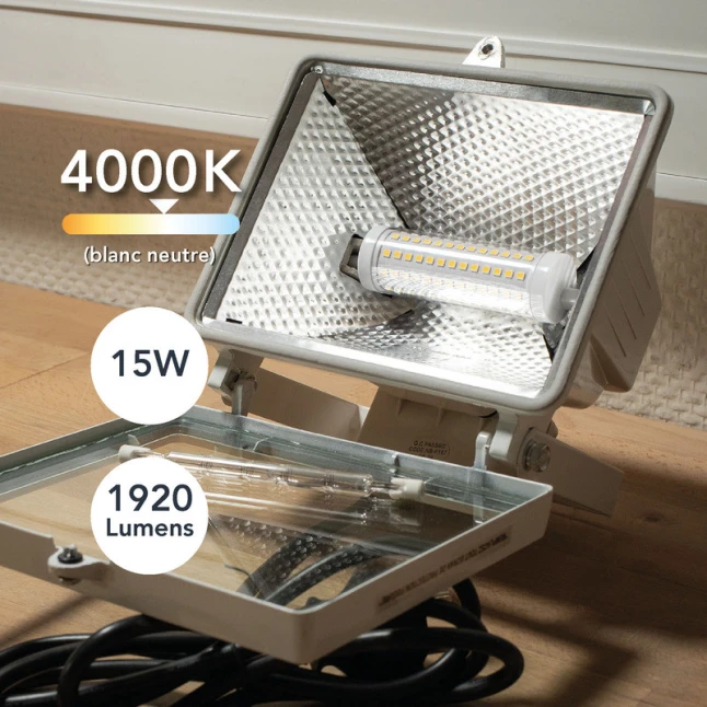 Avec 15 W et 1920 lumens, ce tube LED R7S apporte un flux lumineux élevé pour un projecteur de façade, d’allée ou de zone de travail. Sa température de couleur 4000 K blanc neutre offre une lumière claire et équilibrée, pratique pour voir correctement sans teinte trop froide. Par rapport à un tube halogène R7S, la technologie LED permet de réduire la consommation pour un niveau d’éclairage utile et stable.