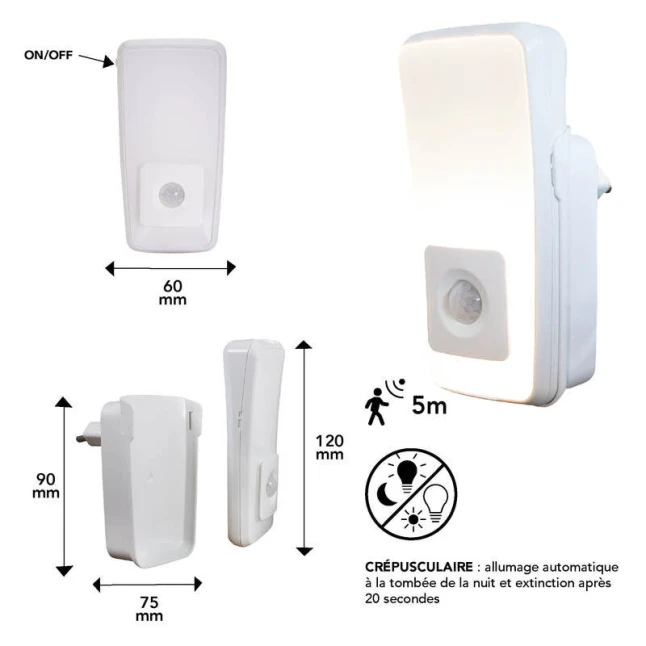 Cette veilleuse LED avec détecteur de mouvement s’allume toute seule quand vous passez, pratique pour éviter de chercher un interrupteur dans le noir. Le capteur crépusculaire limite l’allumage aux moments où la lumière manque, pour plus de confort et moins de consommation. Avec 20 lumens, elle sert surtout au repérage dans un couloir, une chambre ou près d’un escalier. La puissance de 2W reste discrète sur la durée.